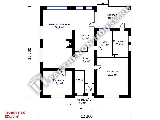 Габаритные размеры дома: 12,200 х 12,200 м.